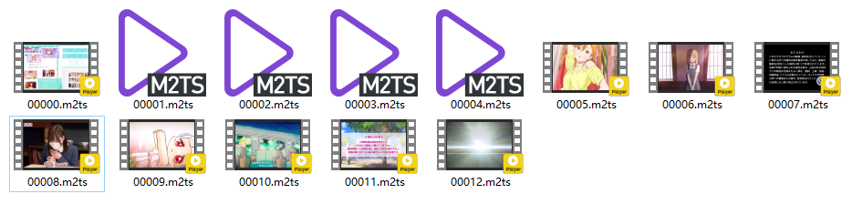 STREAM 文件夹里有各种 m2ts 文件,有可以播放的视频文件,也有无法生成缩略图的文件。这些文件从 00000 开始编号,以不一定连续的数字依次排列。