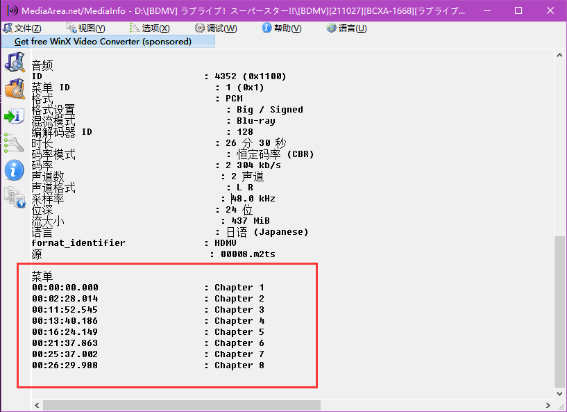 将 mpls 拖到 mediainfo 里可以查看这个播放单元含有的所有 m2ts 的信息。常见的情况是,一张原盘里的两集正片在 mpls 里会连在一起。同时我们也可以看到章节信息,但是这里可能只显示第一个 m2ts 的章节信息。