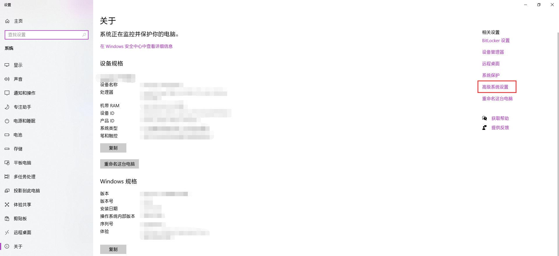 右键我的电脑,选择【属性】。在打开的设置页面最右侧(某些版本中是最左侧)中选择【高级系统设置】。