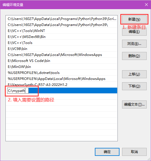 然后在上方的用户变量中选择【Path】一栏进行编辑,新建一个 C:\mypath 条目。