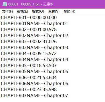 ChapterTool 提供了很多信息,比如说章节的数量、各个章节的时间戳、章节名、帧号。可以看出,这里的帧号是 0-indexed。帧号的计算方法,需要大家掌握。