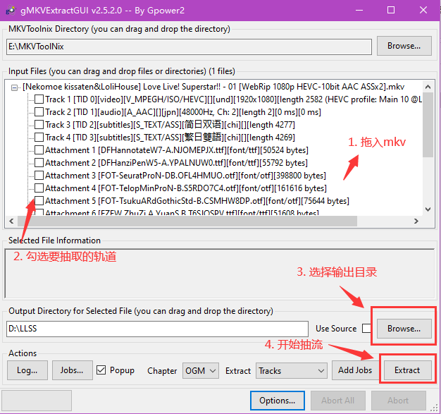 gMKVExtractGUI 也支持批量拖入 mkv,拖入之后依次选择要抽取的轨道即可。