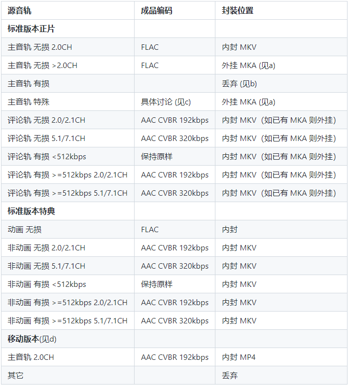原盘的音轨有 PCM / TrueHD / DTS-HD MA 等无损格式,也有 AC3 / DTS 等有损格式。按照 VCB-Studio 规范,对于无损音轨,提取为 flac 格式;对于有损音轨,提取为原本格式。