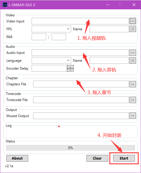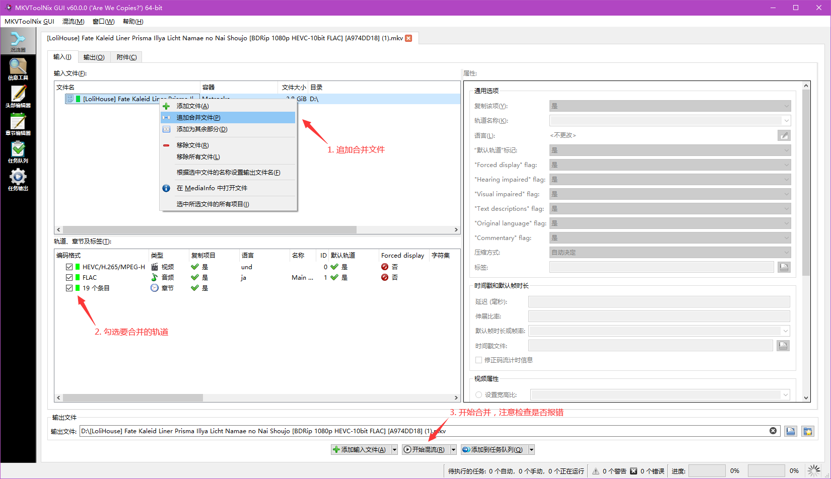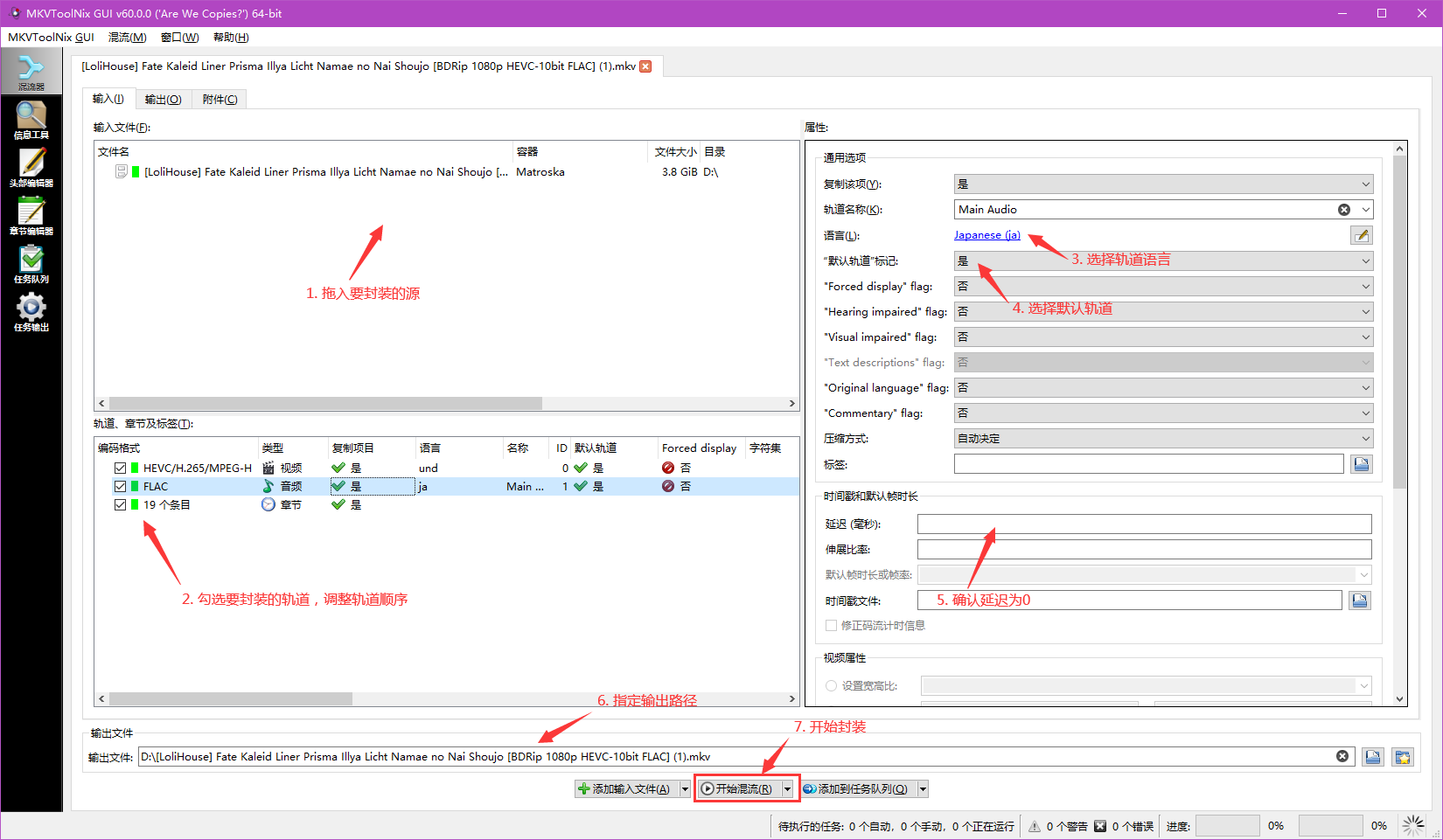 封装 mkv 使用的是之前提到过的唯一指定 mkv 处理工具 MKVToolNix。打开mkvtoolnix-gui.exe,将需要封装的轨道依次拖入,按图中所示操作。