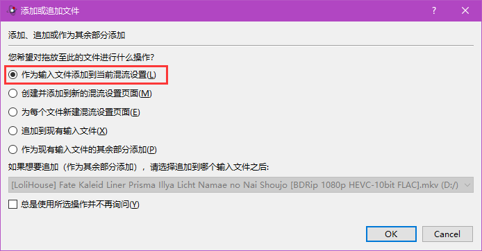 拖入第二个输入文件时,会出现以下弹窗,选择【作为输入文件添加到当前混流设置】。