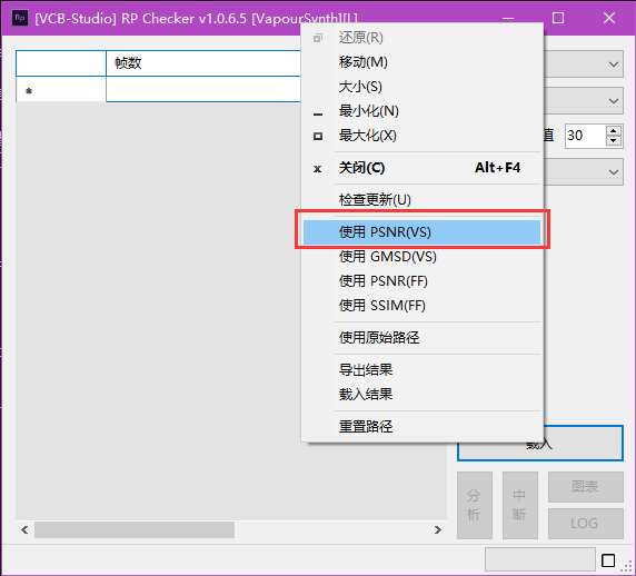 首先在上方右键选择【使用 PSNR(VS)】模式,请不要使用默认的 ffmpeg 模式,其结果相当不可靠。VS 模式需要把 vapoursynth 加入环境变量,vapoursynth 已经集成在 OKEGui\tools 中,加入环境变量的方法可以参考附录。