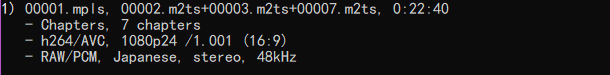 肉酱盘中一个视频分散在多个 m2ts 里,由 mpls 将他们连接起来。我们可以通过 eac3to 来查看视频都由哪些 m2ts 组成。