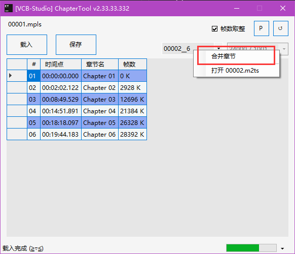 打开 ChapterTool,把 mpls 拖进去。对于具有多个 m2ts 的 mpls,可以在右上角下拉框选择各个 m2ts 的章节。右键下拉框,可以看到【合并章节】的选项,点击就可以将各个 m2ts 的章节合并起来,之后保存为 txt 即可。