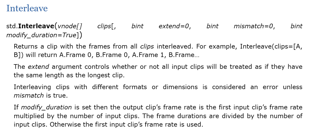 再看滤镜参数,第一个必选参数是 vnode[],即多个 clip 组成的列表。后半部分由 [] 扩起来的,是可选参数,包括 extend, mismatch, modify_duration,都是 bint,也就是 0/1,或者 False/True。它们的功能 doc 里都有说明,不需要掌握,平时根本用不到。