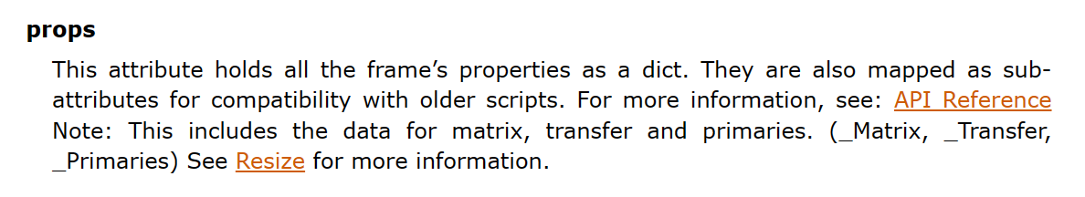实际上我们可以设置任意名字的 frame props,但它们大部分时候并没有用处。而这些由 VS 保留的 frame props 则有重要功能,一些滤镜比如 resize 会读取它们来决定进行何种计算,如果 frame props 指定的不正确就可能产生预料之外的错误结果。