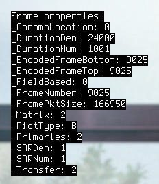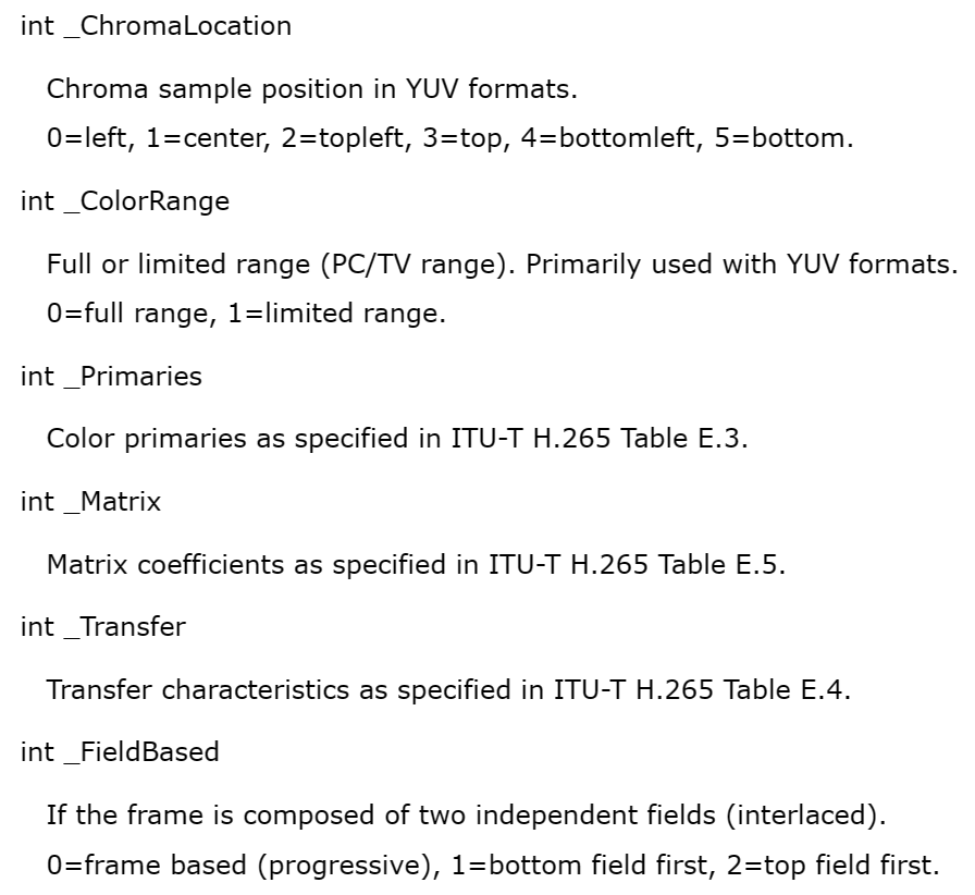 其中重要的属性包括:_PictType, _ChromaLocation, _ColorRange, _Matrix, _Primaries, _Transfer, _FieldBased。