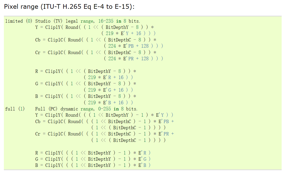 _ColorRange,数值范围,这里很反直觉的是,full=0,limited=1。事实上除了 frame props,其他地方都是 full=1,limited=0。另外文档也给出了具体的计算公式。