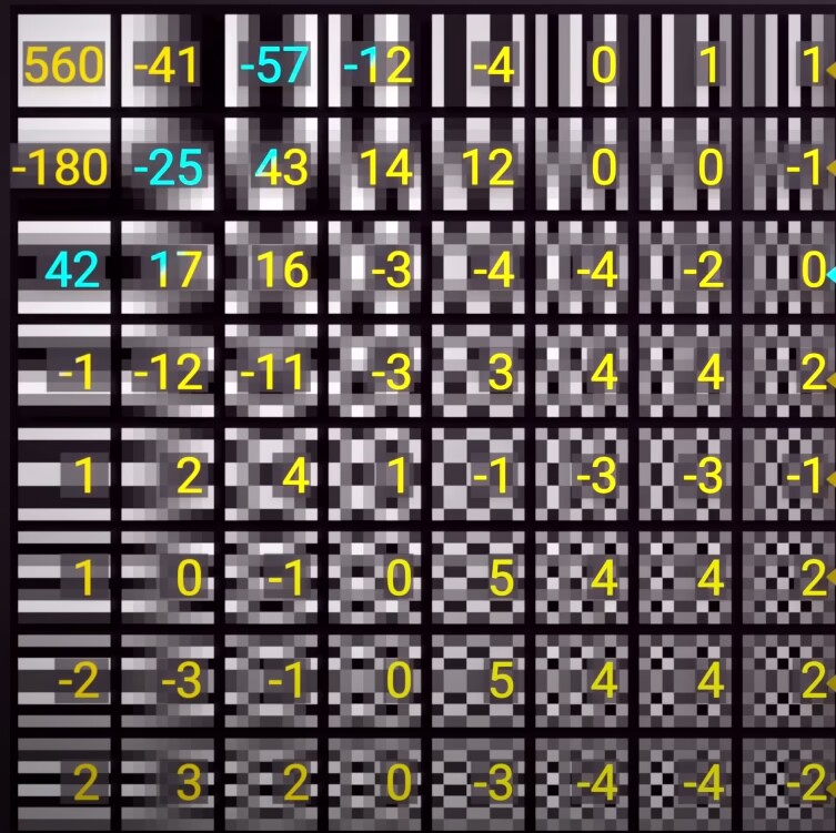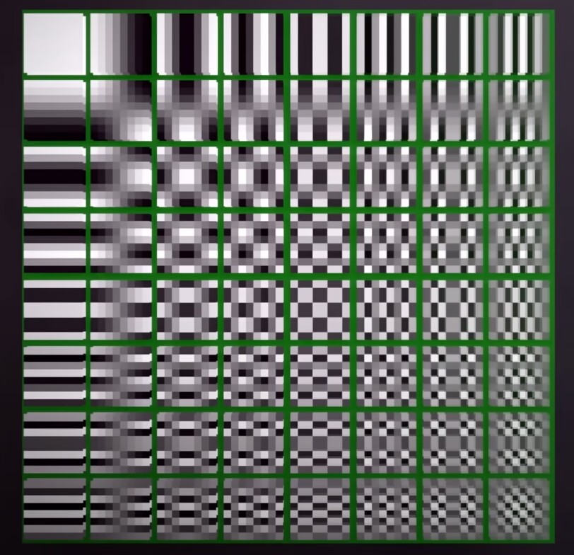 我们通过这张表,可以将任何 8x8 的小块,通过记录每个格子用了多少次,来获得一个 8x8 的矩阵,这个矩阵能拿来重建一切 8x8 的像素。