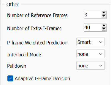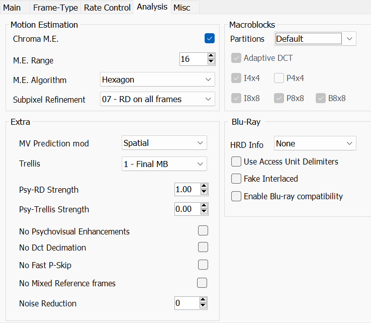 --deblock -1:-1 --preset slower --limit-tu 0 --rskip 0 --ctu 32 --crf 16 --pbratio 1.2 --cbqpoffs -3 --crqpoffs -3 --no-sao --max-tu-size 16 --qg-size 16 --me 3 --subme 5 --merange 32 --b-intra --no-amp --ref 5 --weightb --keyint 240 --min-keyint 1 --bframes 8 --aq-mode 3 --aq-strength 0.8 --rd 5 --psy-rd 1.7 --psy-rdoq 0.8 --rdoq-level 1 --rc-lookahead 80 --scenecut 40 --qcomp 0.65 --no-open-gop --vbv-bufsize 42000 --vbv-maxrate 35000 --no-strong-intra-smoothing --transfer bt709 --colorprim bt709 --colormatrix bt709 --range limited