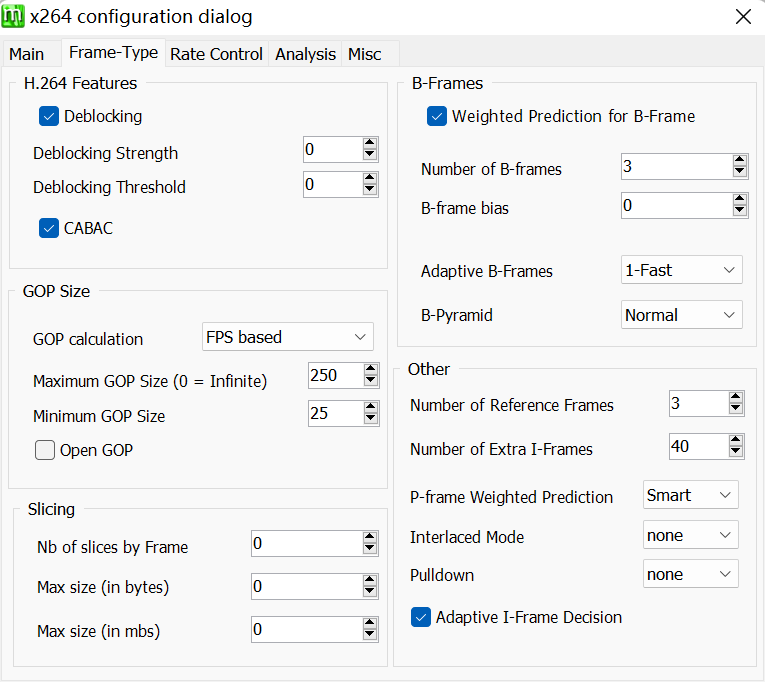 如果大家有 MeGUI 的话,可以打开,在 x264 configuration 里,拥有一个 GUI 的配置界面,里面囊括了几乎所有 x264 编码器可以调整的参数。