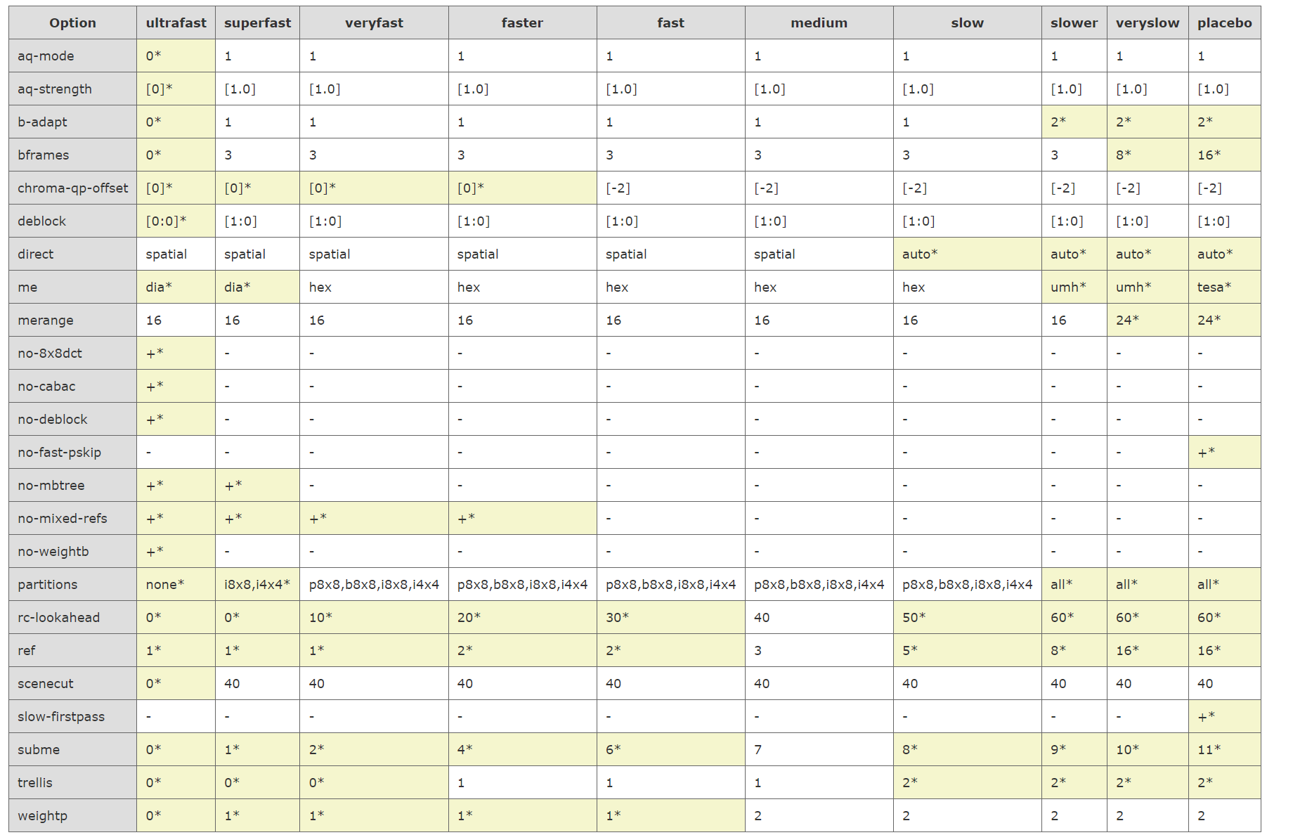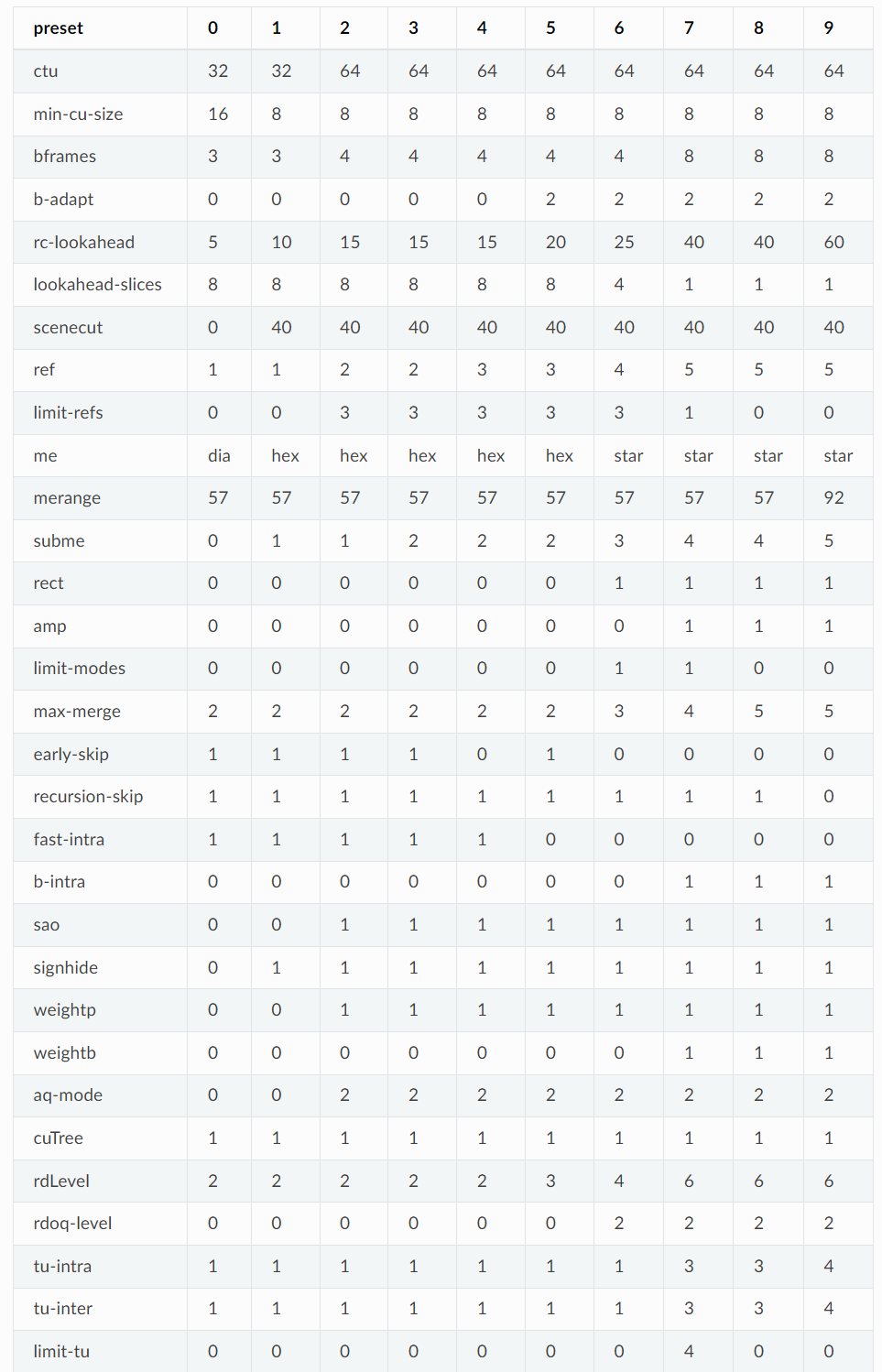可以看到 x265 其实非常面向高分辨率视频去做适配,preset 的 merange 都给的超大。