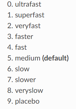 --preset <string>x264 / x265 都有这样的 preset,它决定了你愿意花多大力气,去做帧内编码,帧间搜索,率失真优化。