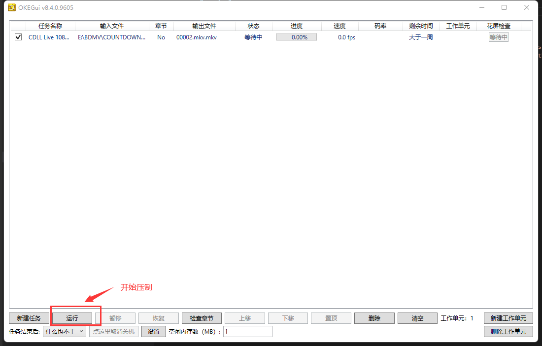 - 当 OKE 处于空闲并且任务列表有被勾选的“等待中”任务时,可以点击“运行”,启动 OKE 开始压制。