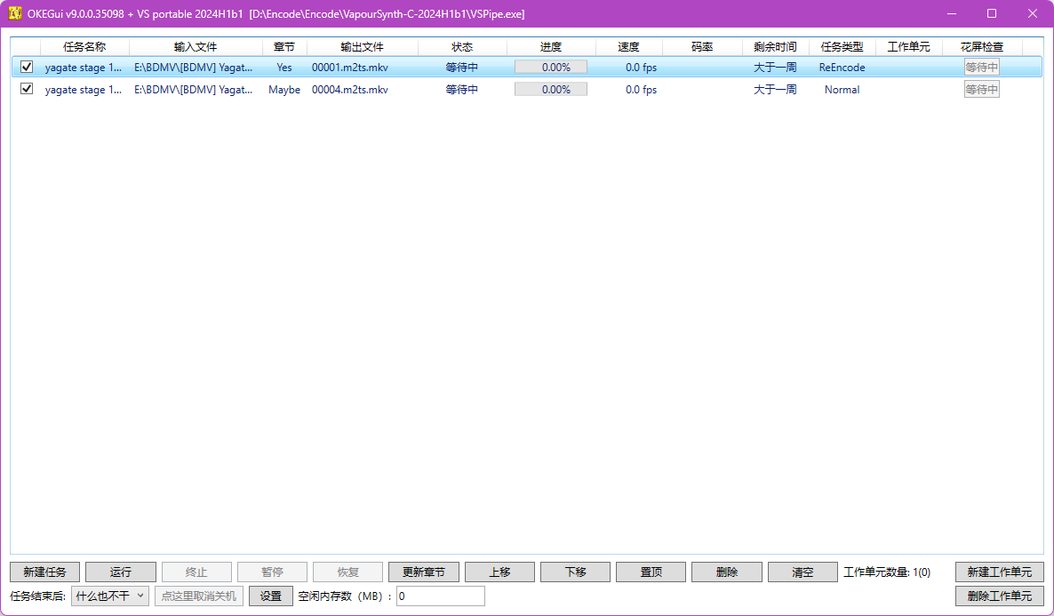 如果载入任务时忘了放置外挂章节,可以在开始压制前放置好章节,使用“更新章节”重新检测章节状态。空闲内存数该功能已经弃用,建议直接填 0。