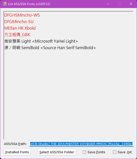 勾选 Save Fonts,并选择 Select ASS/SSA Folder 中指定目录,可以导出系统已经安装的字体。